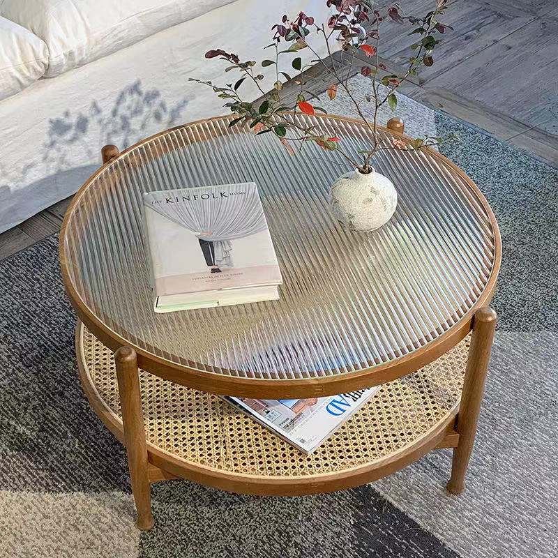 Bàn Trà 035.200.000 VNĐBàn Trà Gỗ Sồi Mộc Xưa Chất liệu: Gỗ Tần Bì Ash kết hợp plywood veneer Ash, mây đan tự nhiên (Có thể lựa chọn loại gỗ khác như gỗ óc chó) Kích thước: D800 Mặt Bàn: kính sóng Màu sắc: màu nâu óc chó, màu vàng gỗ tự nhiên