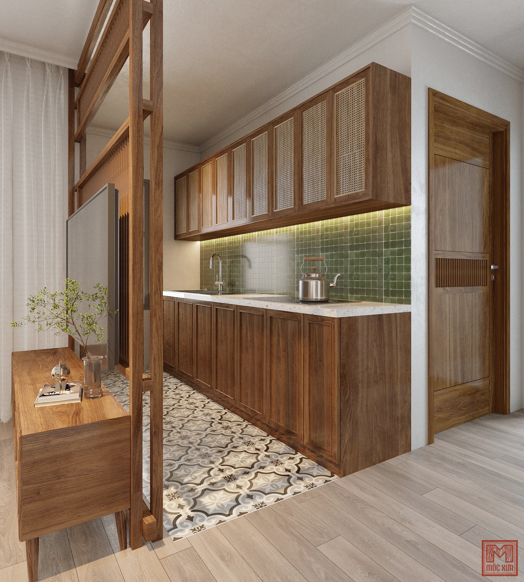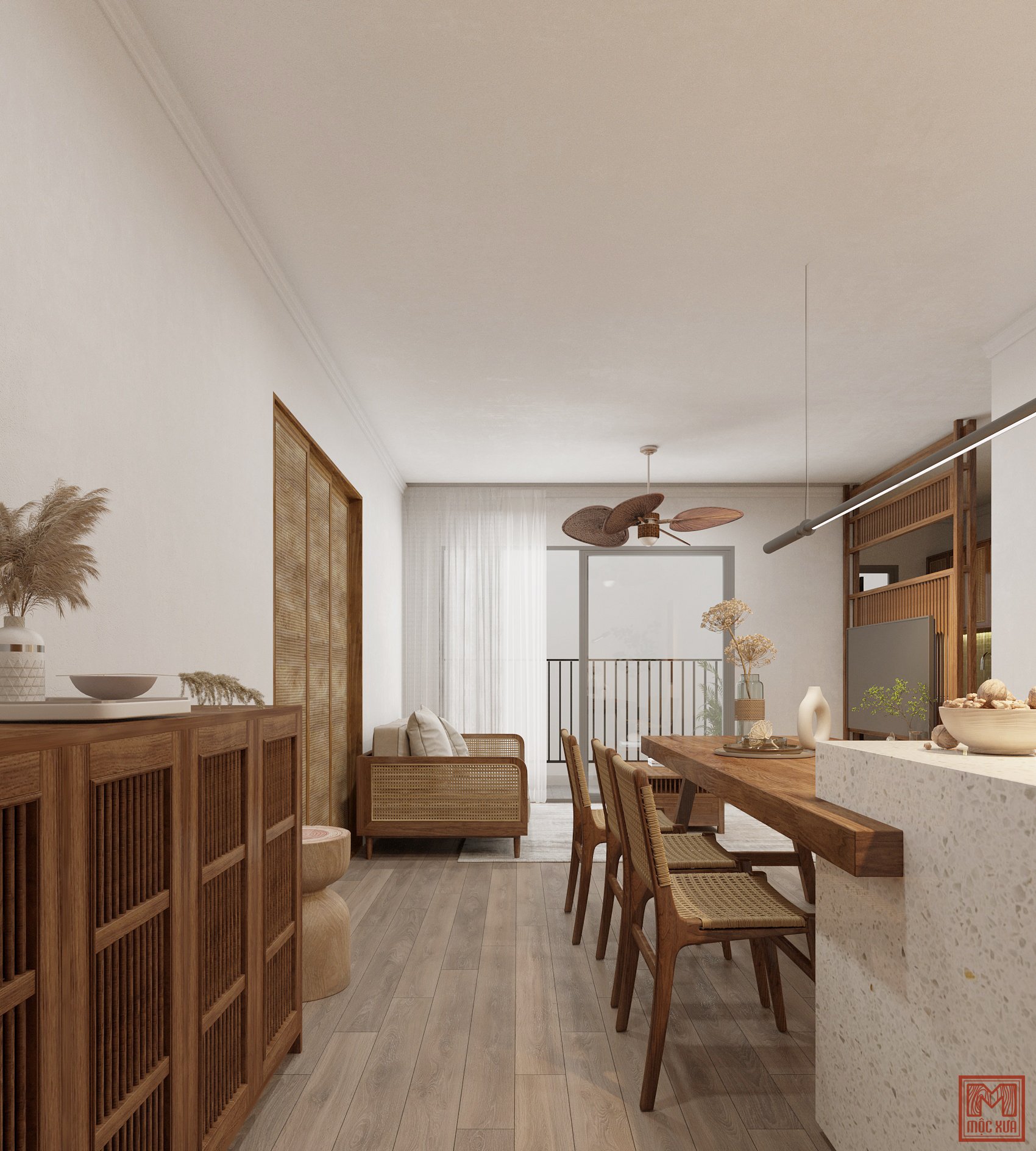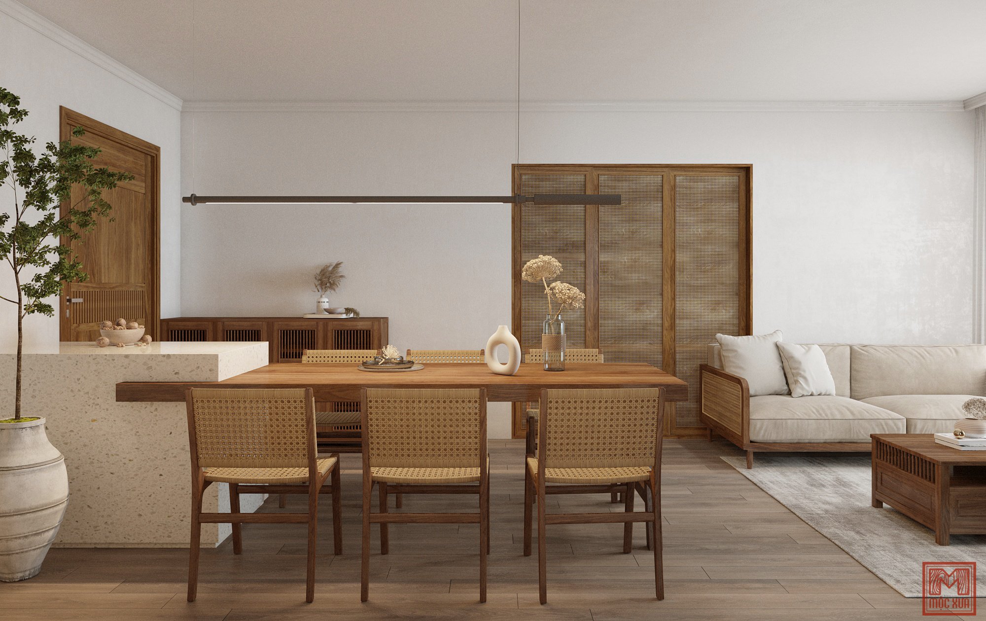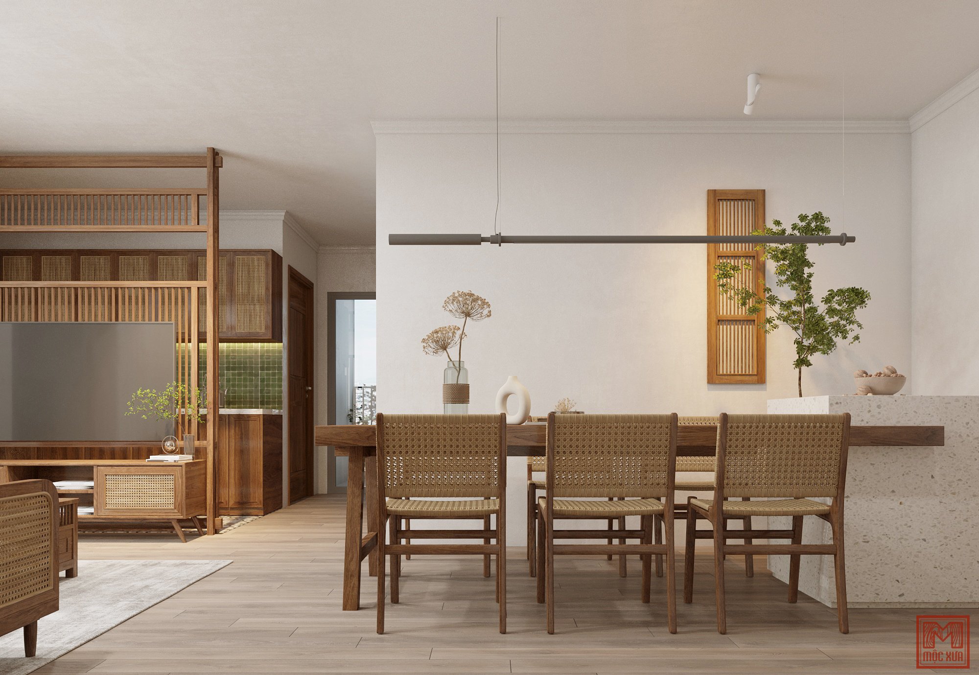 Với chất liệu gỗ sồi tự nhiên và mây đan tự nhiên, nội thất mộc mang hơi thở thiên nhiên và giản dị. Điều này mang đến một không gian đơn giản, tự nhiên, đầy tinh tế phù hợp cho những người thích không gian yên bình, mộc mạc.